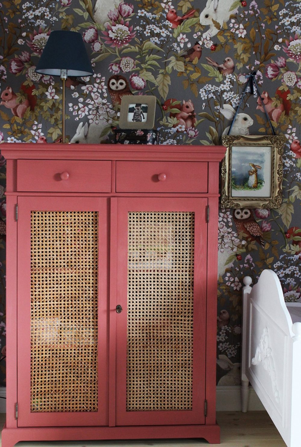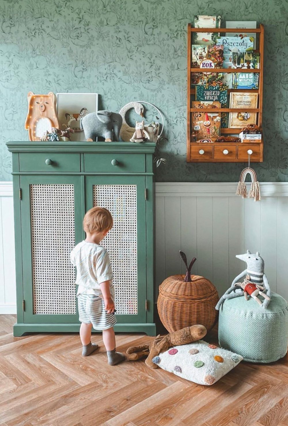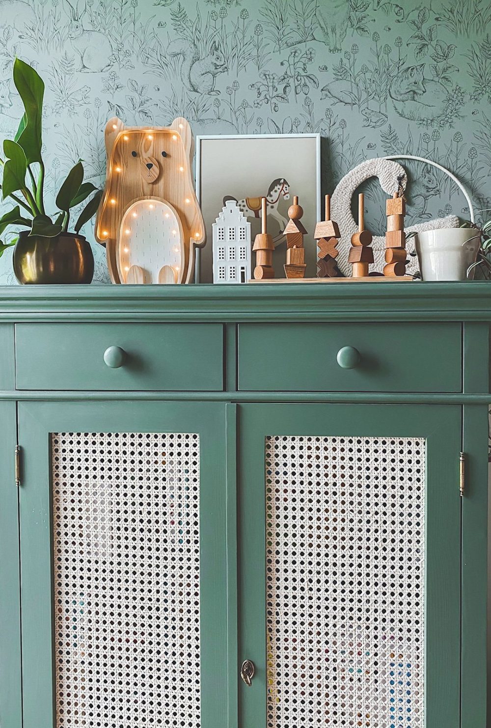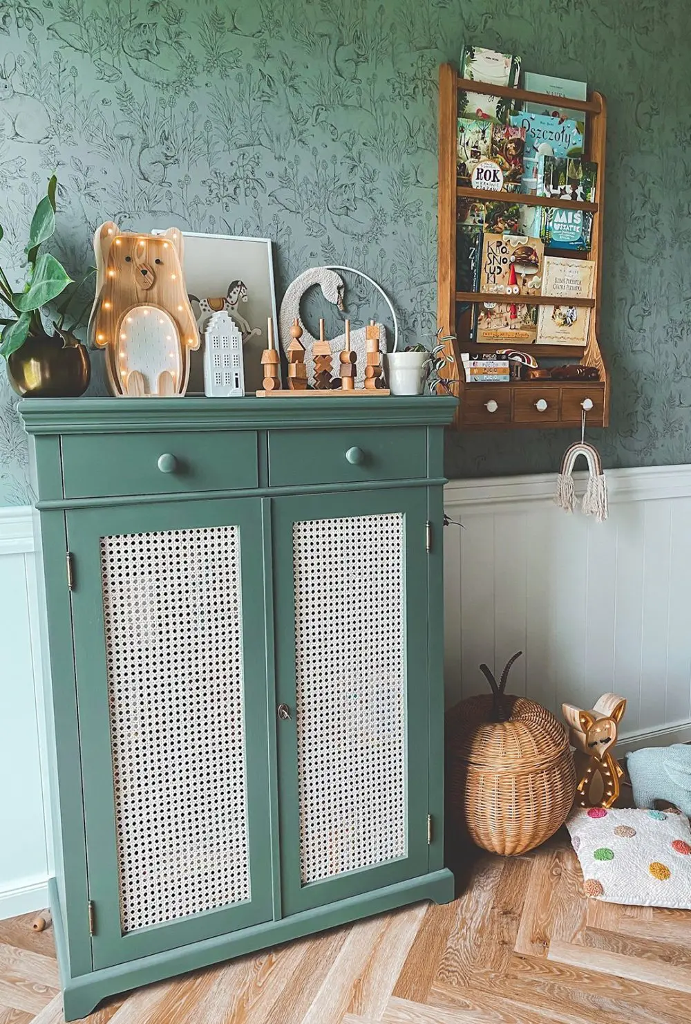 Material: Solid pine wood, painted with oil-wax or water-based paint compliant with EN 71-3 standards, natural rattan webbing (or glass).