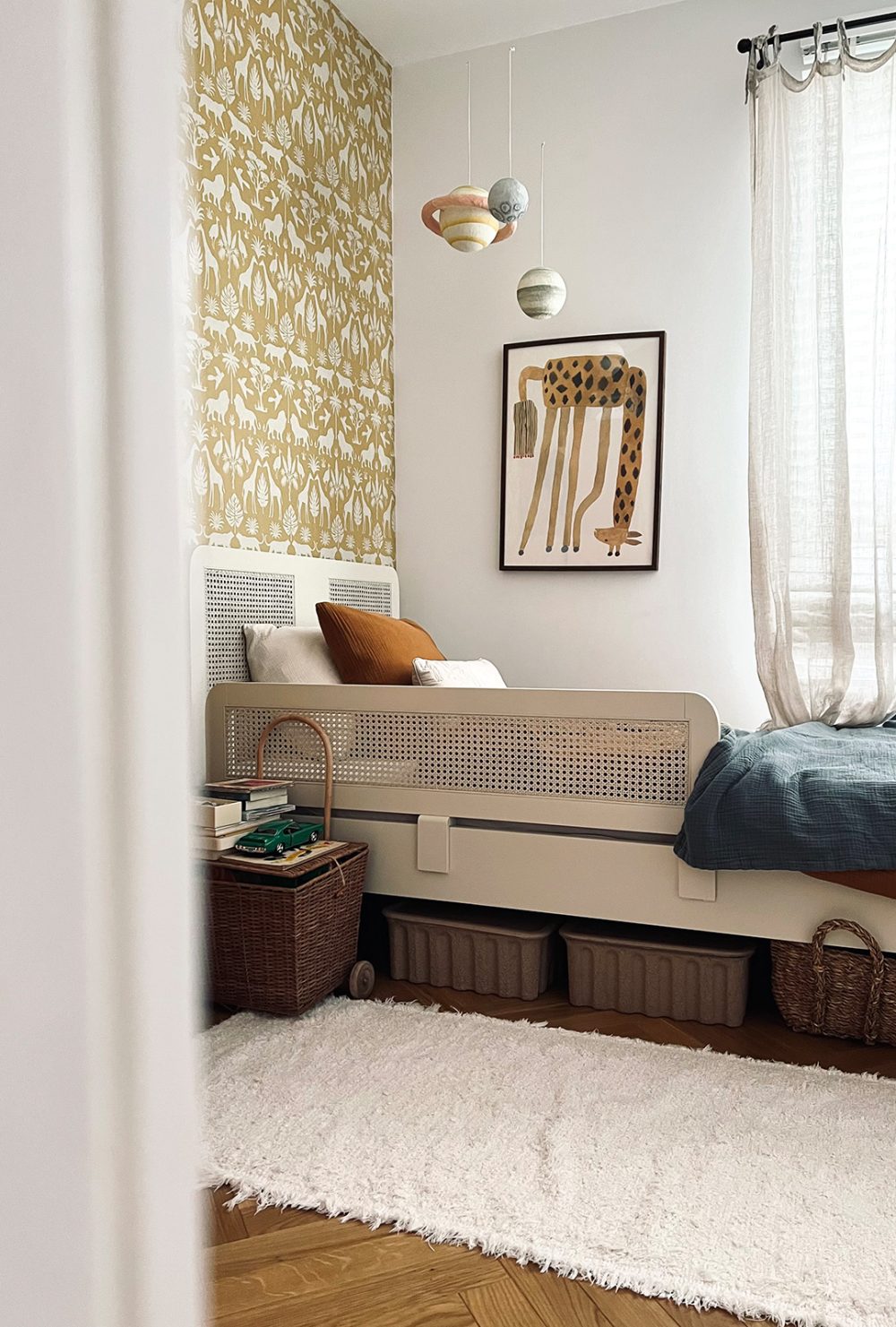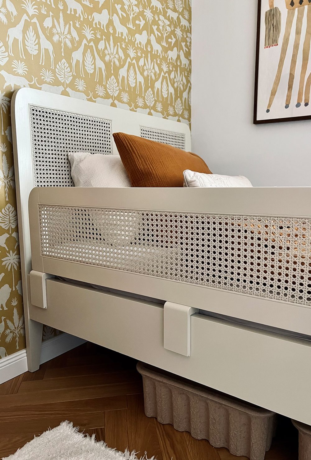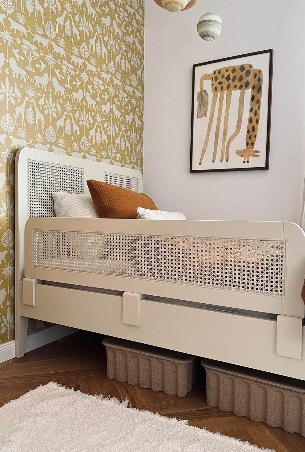Rattanowa barierka do łóżka ODDE – stylowa, funkcjonalna, dziecinnie prosta w użyciu.